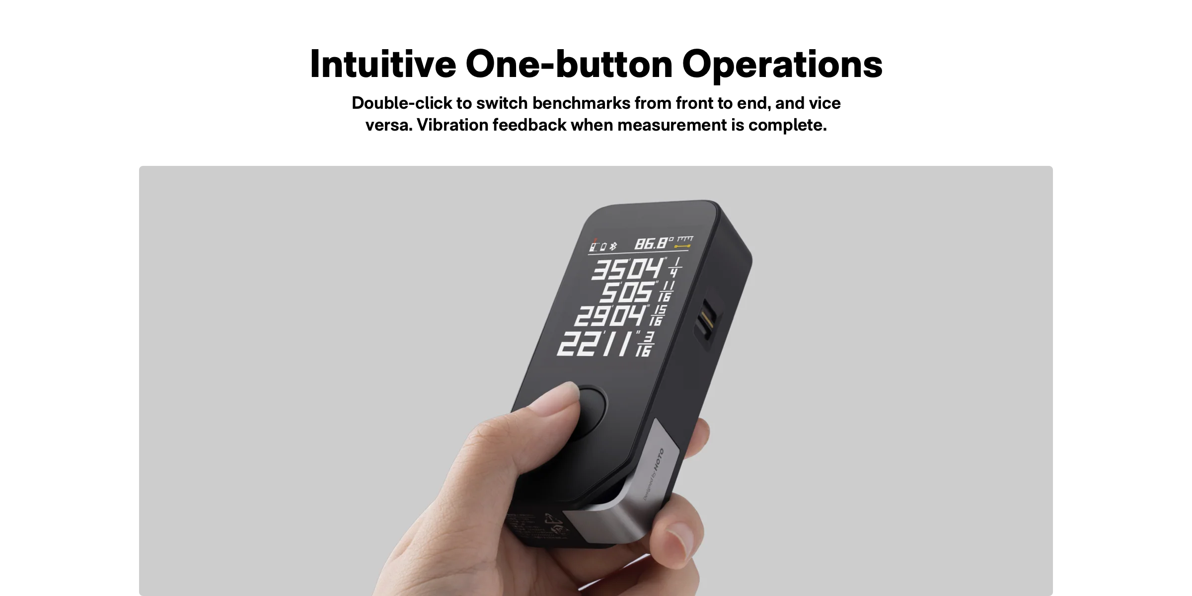 • HOTO Laser Measure PRO device on a gray surface with a dark background HOTO Laser Measure PRO device on a gray surface with a dark background